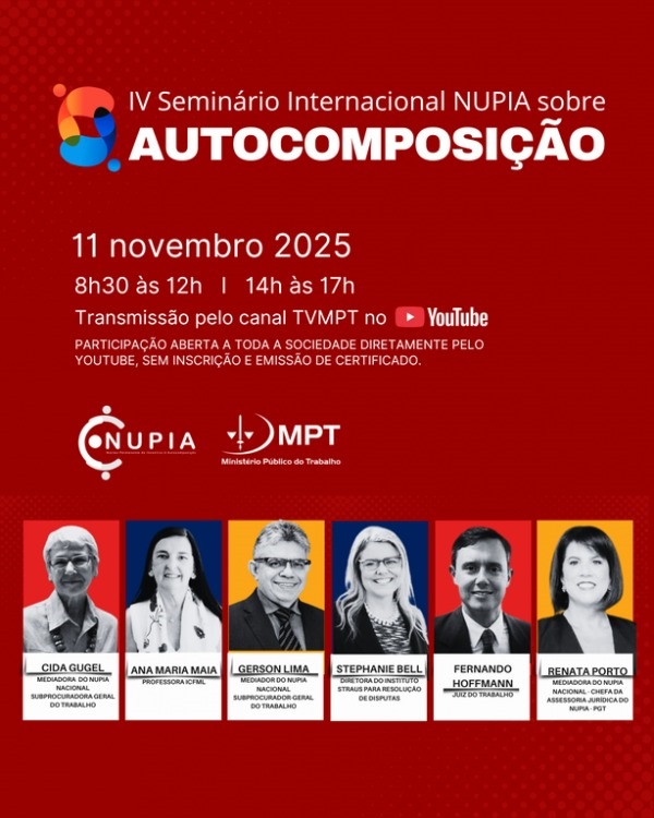 No dia 11 de novembro de 2025, Ana Maria Maia Gonçalves, fundadora do ICFML – Instituto de Certificação e Formação de Mediadores Lusófonos, participou como palestrante convidada no IV Seminário Internacional sobre Autocomposição, promovido pelo NUPIA – Núcleo Permanente de Incentivo à Autocomposição do Ministério Público do Trabalho no Brasil (MPT).